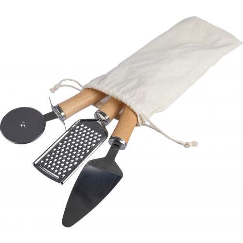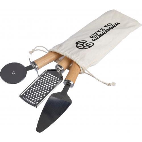 Metalen en houten keukengereedschapset, inclusief een roestvrijstalen rasp, taartschep en pizzasnijder, elk met een houten handgreep. Verpakt in een katoenen trekkoordzak met trekkoordsluiting.
