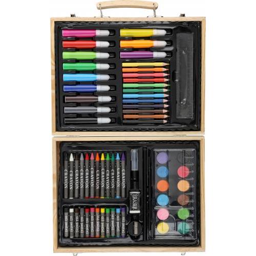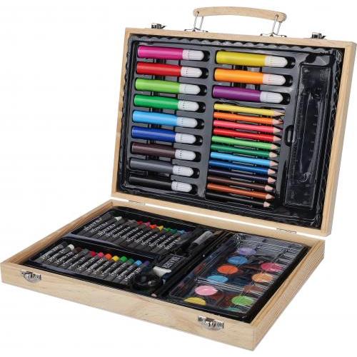 Multiplex tekenset in een dennenhouten koffer met houten handgreep, bestaande uit 66 onderdelen: 12 waskrijtjes, 12 kleurpotloden (geslepen), 12 viltstiften, 12 oliekrijtjes, een lijmstift, een gum, een puntenslijper, een liniaal, een penseel, 12 verfblokjes en een palet. Per stuk verpakt in een bruine kartonnen doos, met de handgreep toegankelijk voor eenvoudig dragen.