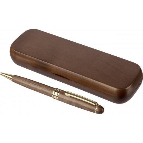 Walnoothouten en messing balpen met draaimechanisme, metalen punt, clip en afwerking. Voorzien van blauw schrijvende Duitse Dokumental-inkt met een schrijfduur van ongeveer 1.000 meter. Geleverd in een esdoornhouten doos en een bruine kartonnen doos. Blauwe inkt.