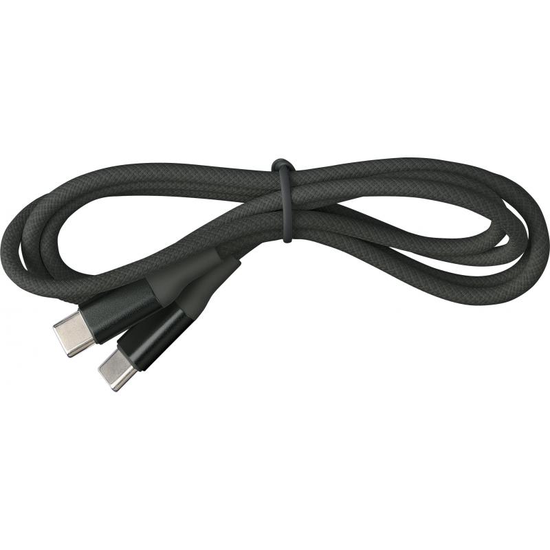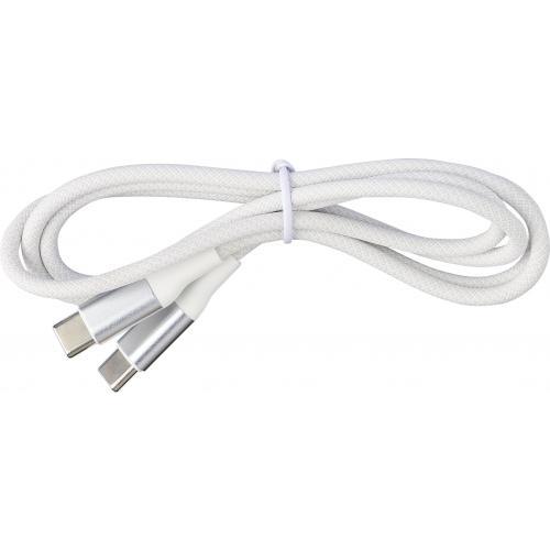 Nylon Type-C naar Type-C data- en oplaadkabel van 1 meter lang. Gegevensoverdrachtssnelheid van 120 Mbps. De aluminium stekker is vergroot voor bedrukking. 35W oplaadoutput. Per stuk verpakt in een bruin kartonnen doos.