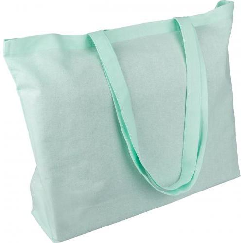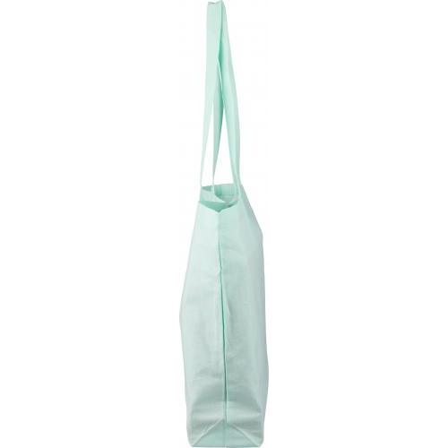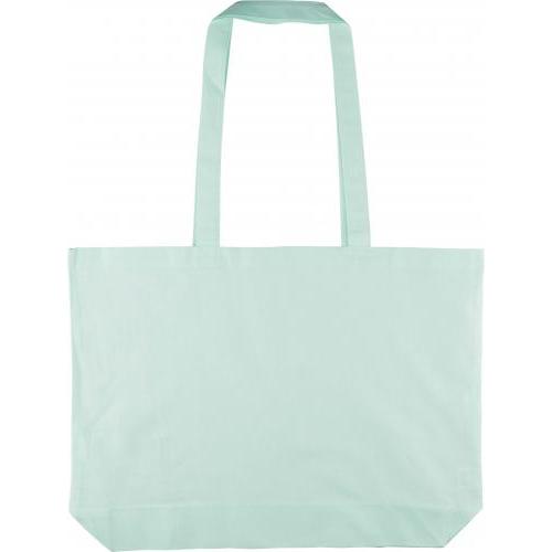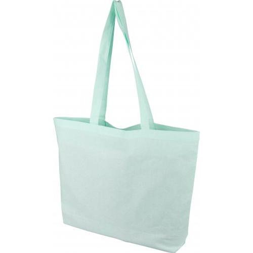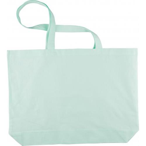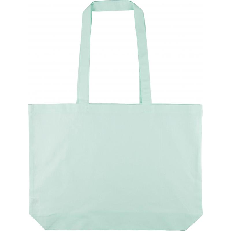 Katoen (14 g/m²) boodschappentas met een bodemvouw van 10 cm en lange hengsels (70 cm lang, 2,5 cm breed). Pastelkleurig katoen in PMS 9562U (groen), 162U (oranje), 317U (blauw) en 522U (paars). Dit product is OEKO-TEX® STANDAARD 100 gecertificeerd.