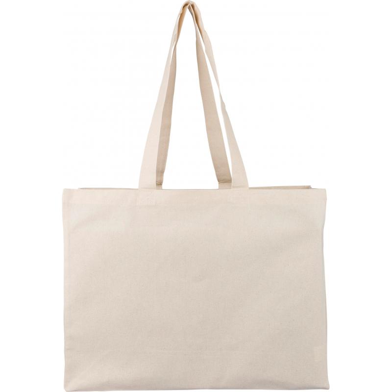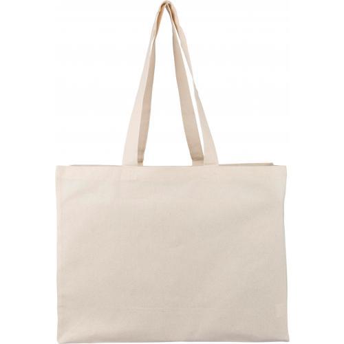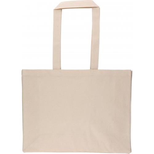 Katoen (18 g/m²) boodschappentas in natuurlijke kleur met D-vormige bodemvouw. Afmeting 43 × 34 × 13 cm met 67 cm lange hengsels (3 cm breed). Dit product is OEKO-TEX® STANDAARD 100 gecertificeerd.