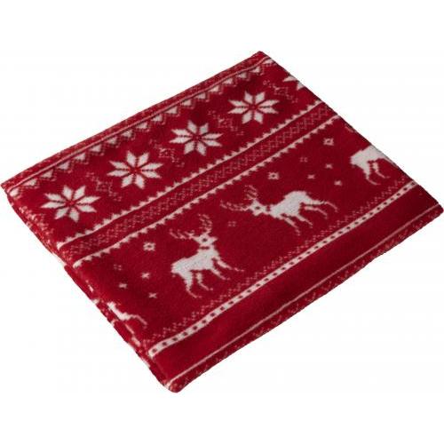 100% Polyester Polar fleece deken (180 gr/m²). De deken heeft een geprint patroon van rendieren. Gebonden met polyester band.