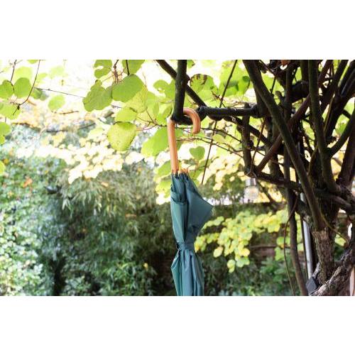 Klassieke automatische polyester paraplu (190T), met 8 panelen, gebogen houten handvat, tips en steel, metalen baleinen en klittenbandsluiting.