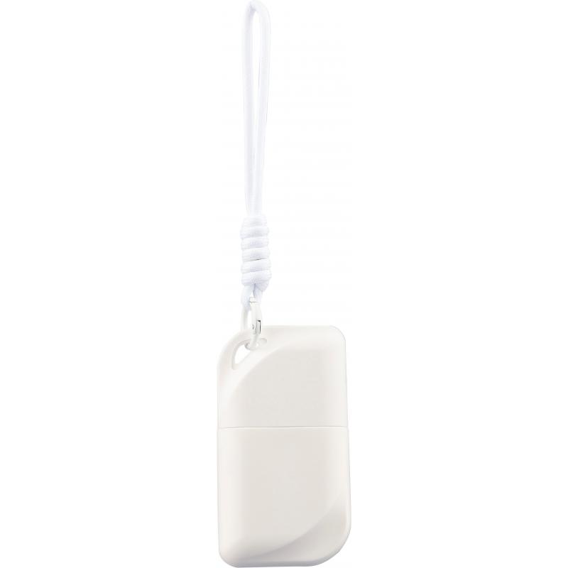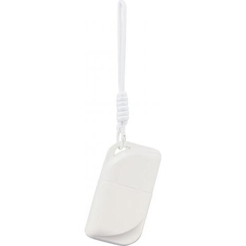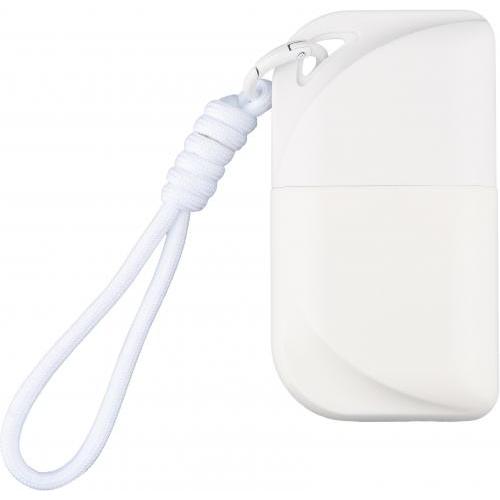 Cassette van PP met 50 ml zonnebrandlotion (SPF50) en een polskoord van polyester in bijpassende kleur met metalen haakje. Voorzien van een boekje-sticker op de achterzijde.