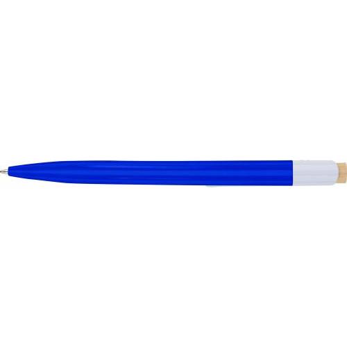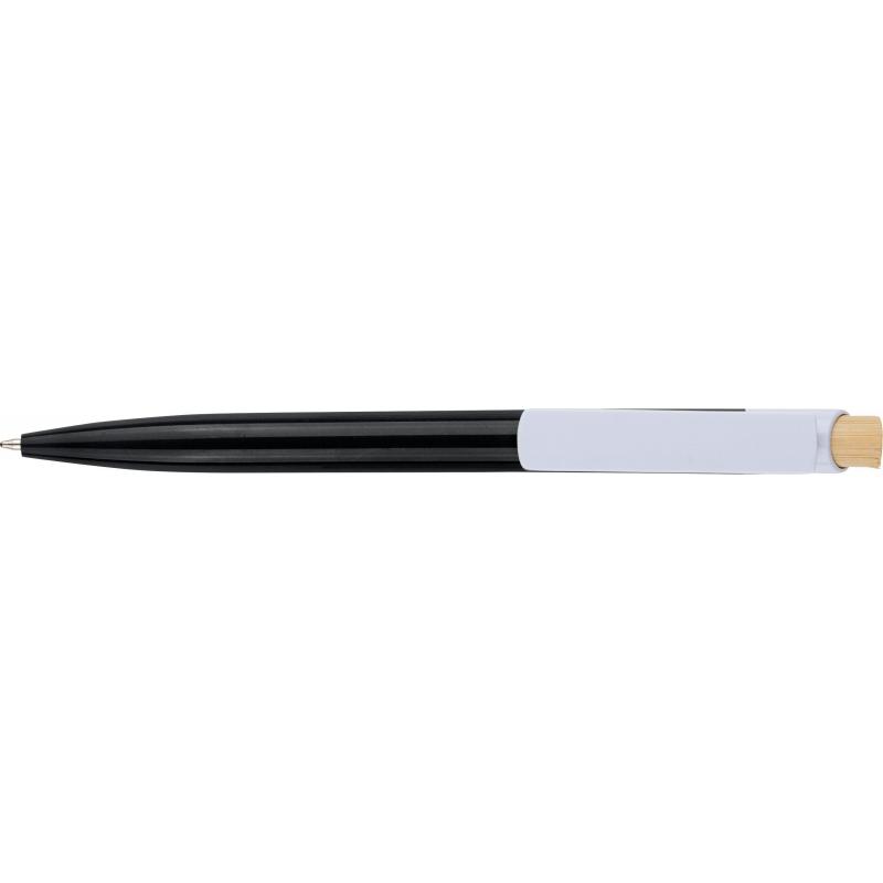 Gerecycleerde ABS balpen met bamboe drukknop en witte clip, geschikt voor digitale bedrukking. Voorzien van een gerecycled logo in het in-mould. Geschatte schrijflengte van 600 meter. Blauwe inkt.