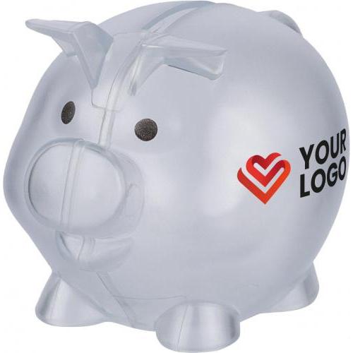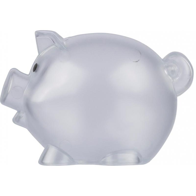 Spaarvarken van gerecycled PS-plastic in de vorm van een varken. Transparante uitvoering met gerecycled logo op de achterkant.