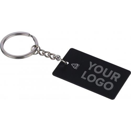 Gerecycleerde roestvrijstalen rubberen sleutelhanger met metalen ring in een rechthoekige vorm. Voorzien van een gegraveerd gerecycled logo dat na gravering een glanzend spiegeleffect onthult. Per stuk verpakt in een kraftpapieren envelop.