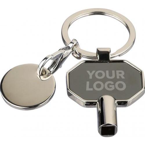 Sleutelhanger van gerecycled zinklegering met radiatorsleutel en winkelmunt. Voorzien van een vierkante sleutel van 5 x 5 mm, de meest gebruikte maat in Europa om radiatoren te ontluchten. Geleverd met stevige metalen sleutelring en gerecycled logo. Individueel verpakt in een bruine kartonnen envelop met illustratie.