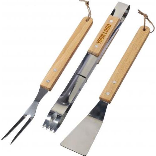 Roestvrijstalen barbecueset met houten handvatten. De tools omvatten een spatel, vork en tang. Verpakt in een stevige kraft geschenkdoos.