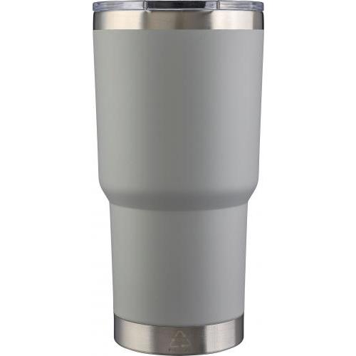 Roestvrijstalen dubbelwandige beker (590 ml) met PS-deksel. Gerecycled logo gegraveerd op de beker. De binnenkant is van roestvrij staal 304 en de buitenkant van roestvrij staal 201. Per stuk verpakt in een bruin kartonnen doos.
