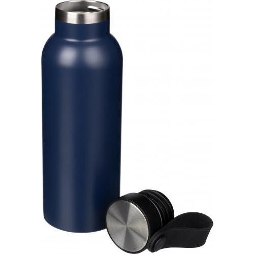 Roestvrijstalen dubbelwandige drinkfles (500 ml) met een PP-drukknopdop en siliconen band met metalen detail. Drukknop om de drinktuit te openen of te sluiten. De binnenkant is van roestvrij staal 304 en de buitenkant van roestvrij staal 201. Per stuk verpakt in een bruin kartonnen doos.