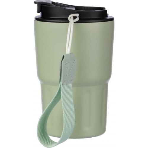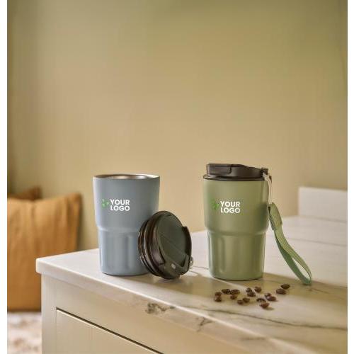 Roestvrijstalen poedergecoate dubbelwandige drinkmok (320 ml). Roestvrij staal 304 aan de binnenkant en roestvrij staal 201 aan de buitenkant. Draagband aan de zijkant en PP deksel. Verpakt per stuk in een bruine kartonnen doos.