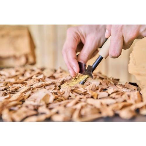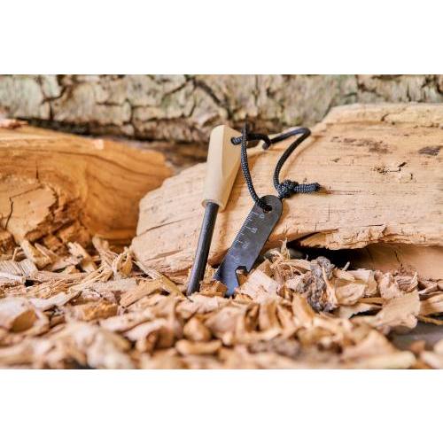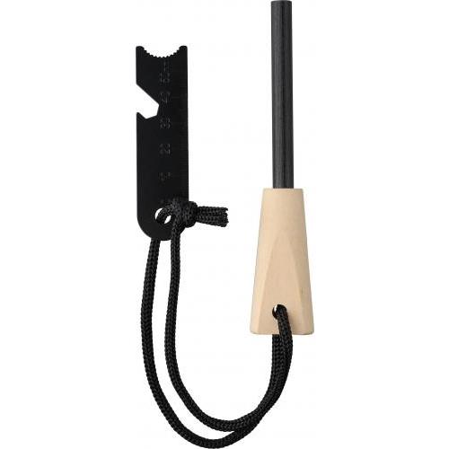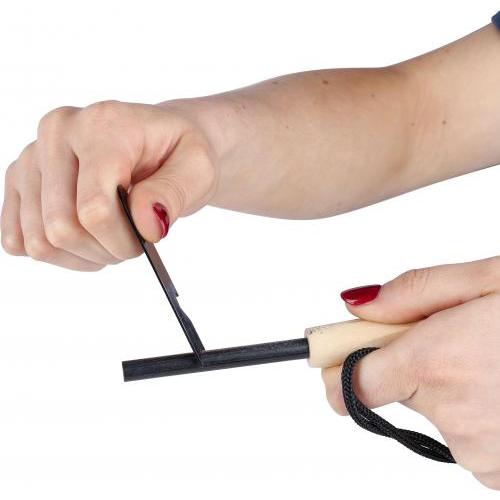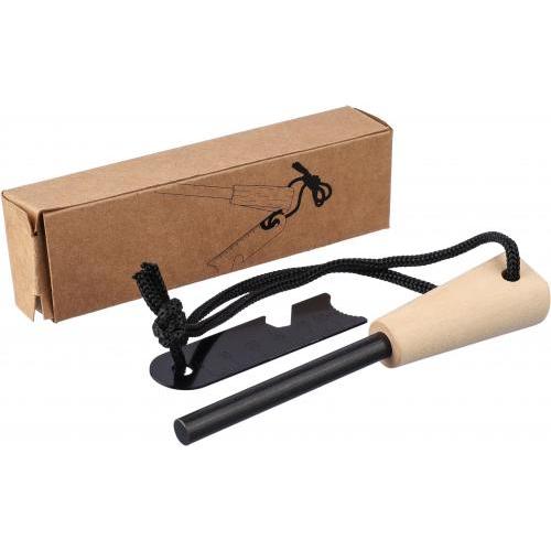 Roestvrijstalen vuurstarter met handvat van grenenhout en polyester koord dat het schraapgereedschap en het aansteekstaafje verbindt. De multifunctionele schraper bevat een flesopener, precisiemeetlat en inbussleutel. Voor activering: kras de zwarte coating van het aansteekstaafje vóór gebruik. Twee delige set. Individueel verpakt in een bruine kartonnen doos.