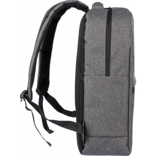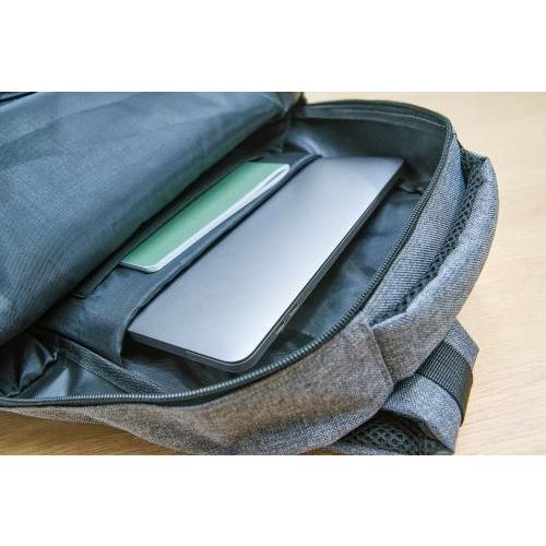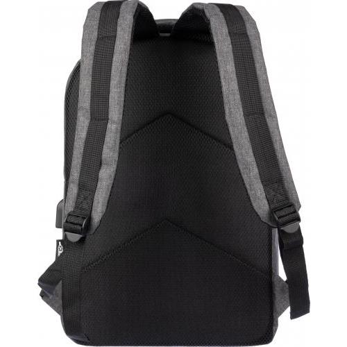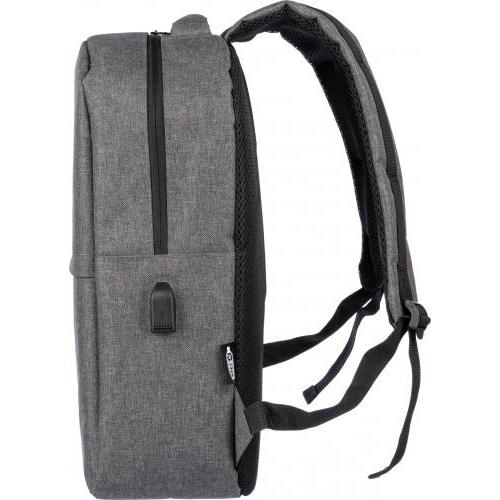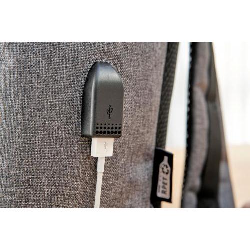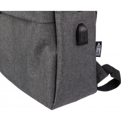 rPET (600D) rugzak met USB-poortopening (en USB-kabel binnenin) met een groot vak met rits aan de bovenkant en een vak met rits aan de voorkant. Binnenin is er een vak voor 10-inch apparaten en één voor 15-inch apparaten. Met verstelbare banden.