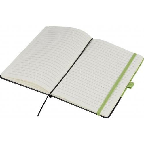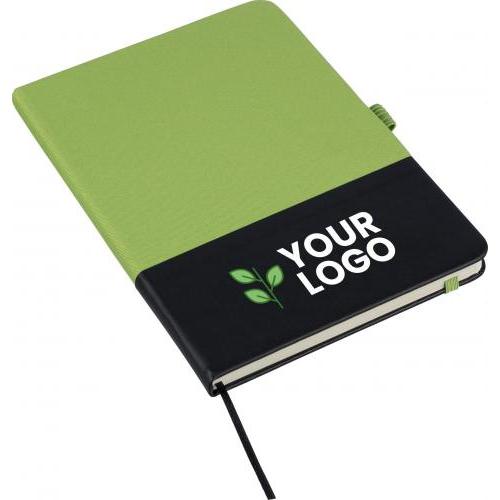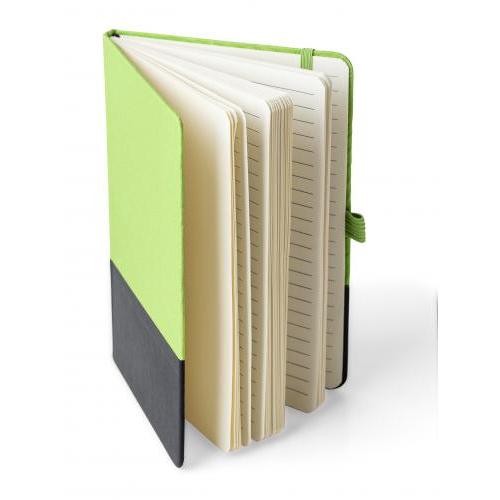 A5-notitieboek van rPET-polyester met deels laserbaar PU-voorvlak. Na graveren komt er een kleur tevoorschijn die overeenkomt met de rPET-stof. Voorzien van 80 gelinieerde pagina’s van 70 gsm, elastiek, pennenlus en bladwijzerlint. Het onderste PU-gedeelte is ontworpen om gegraveerd te worden en zo de bijpassende kleur zichtbaar te maken.