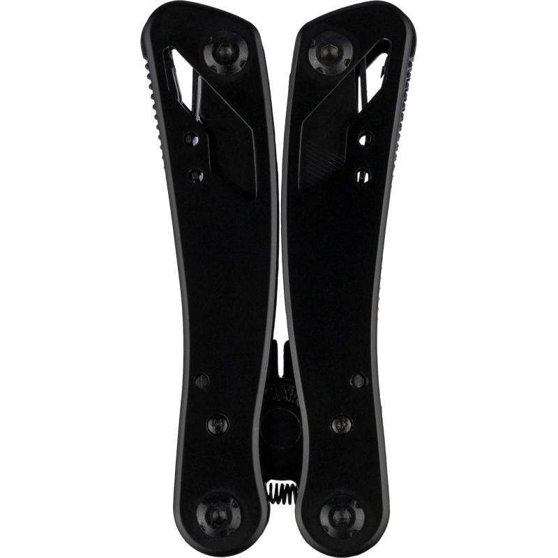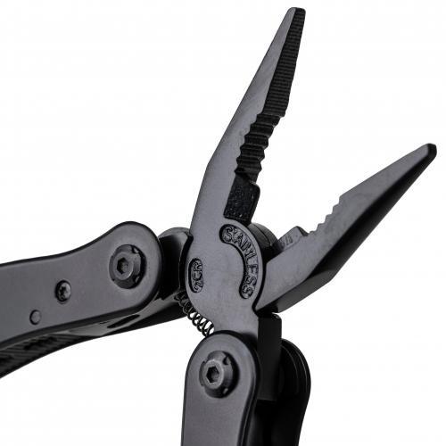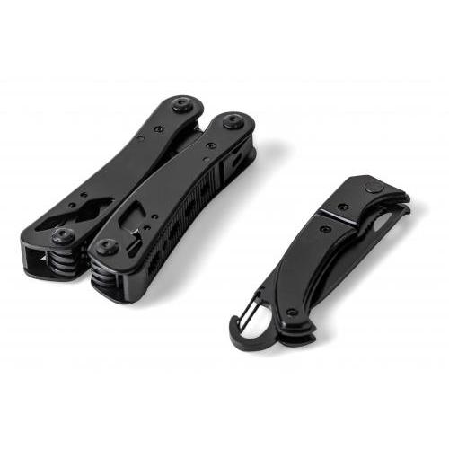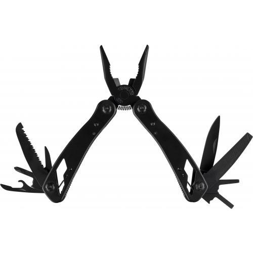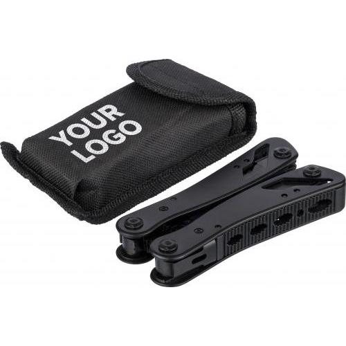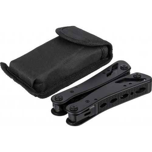 Multitool van zwart aluminium en roestvrij staal met 13 functies, waaronder messen, schroevendraaiers, tangen, zaag, vijl, hefboom, bits, veer, lusstaaf, blikopener en tang. Wordt geleverd met een etui met klittenbandsluiting voor aan de riem. Individueel verpakt in een bruine kartonnen doos.