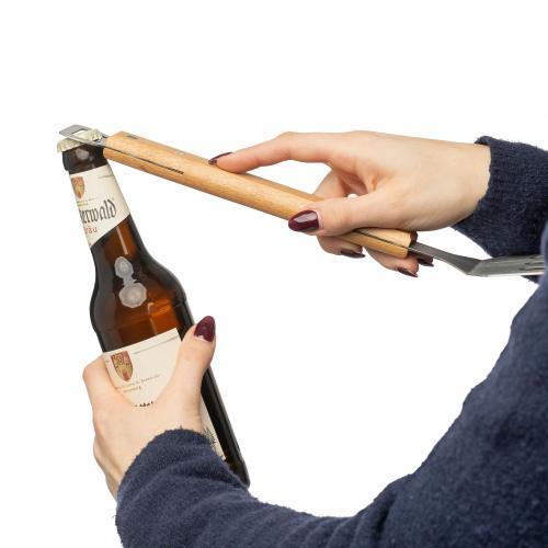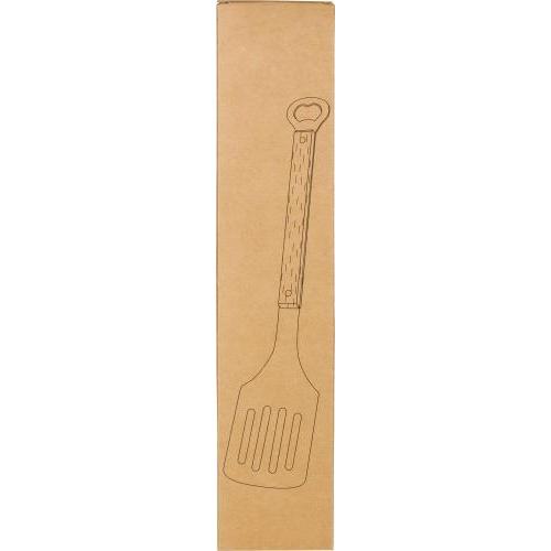 Barbecuespatel van roestvrij staal met handvat van beukenhout en geïntegreerde flesopener aan het uiteinde. Individueel verpakt in een bruine kartonnen doos.