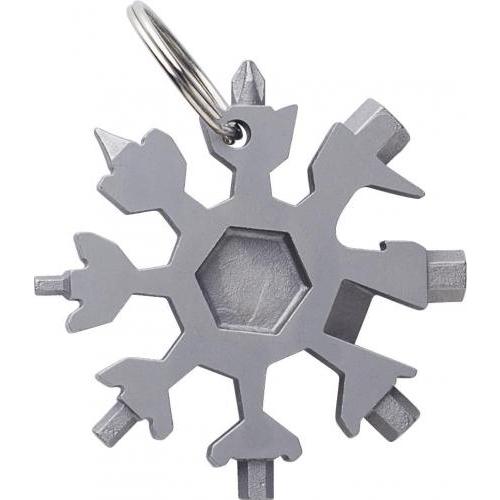 RVS multitool met 17 functies (sleufschroevendraaier, flessenopener, moersleutel, touwmes en inbussleutels van verschillende grootte). Inclusief sleutelhanger. In de vorm van een sneeuwvlok. Individueel verpakt in een bruine kartonnen doos.