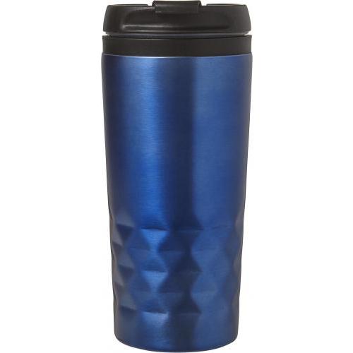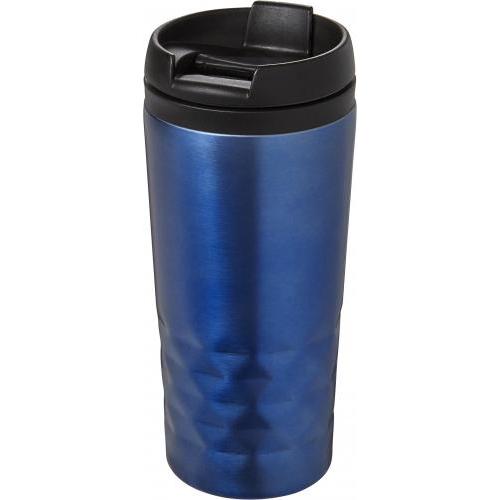 Roestvrijstalen reismok (300 ml) met zwarte deksel. Ook verkrijgbaar in gekleurd roestvrijstaal. De mok is dubbelwandig en de drinkopening heeft een klep.