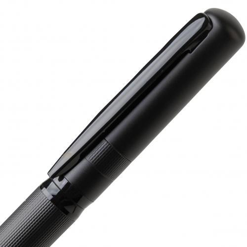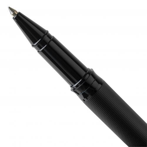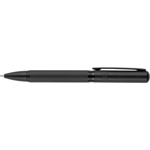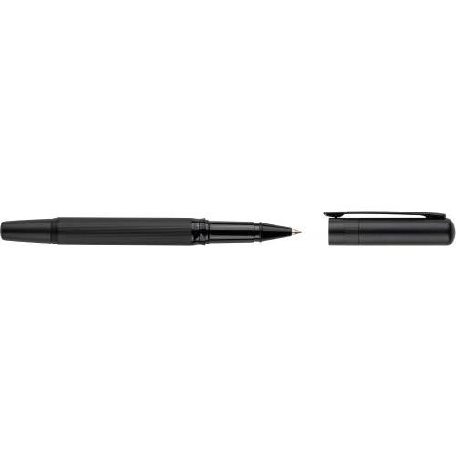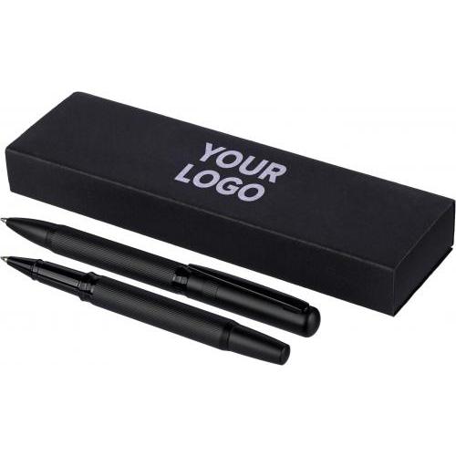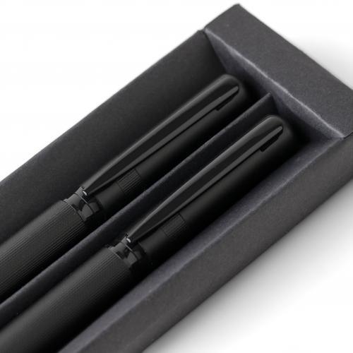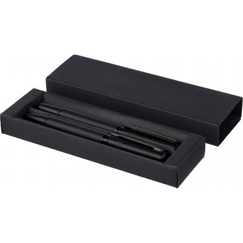 Set van een balpen met draaimechanisme en een rollerpen, gemaakt van metaal en ecobrass. Beide pennen zijn voorzien van blauw schrijvende Duitse Dokumental-inkt. De balpen heeft een schrijfafstand van ongeveer 1.000 meter, de rollerpen tot 400 meter. Geleverd samen in een zwarte schuifdoos. Blauwe inkt.