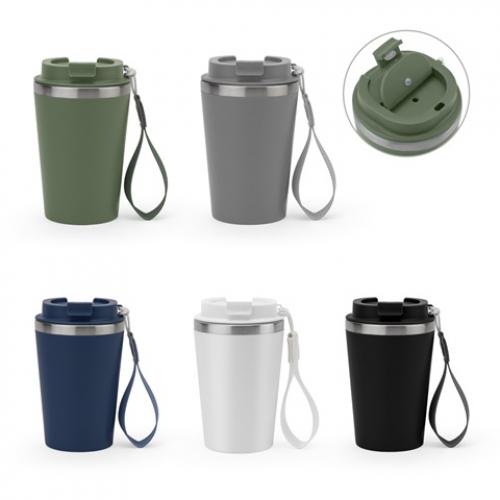 Roestvrijstalen reisbeker 90% rss met dubbele wand en matte afwerking. Het pp deksel is lekvrij en heeft een pu en pet handvat voor gemakkelijk transport. Capaciteit tot 460 ml. Geleverd in een cadeauverpakking van kraftpapier