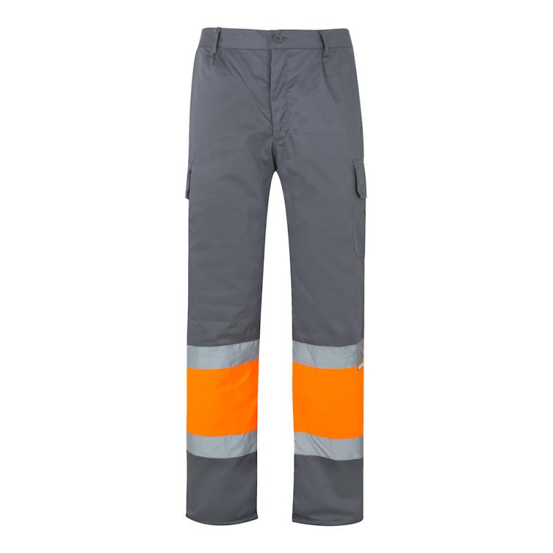 Tweekleurige twill broek 210gm² gevoerd met meerdere zakken van katoen 20% en polyester 80%. Met elastische tailleband met reflecterende strepen aan de onderkant van de broek. Bevat zes zakken 2 franse zakken 2 zijbalgzakken en 2 achterzakken. Product in overeenstemming met euverordening 2016425 gecertificeerd door en20471 en klasse nº 1