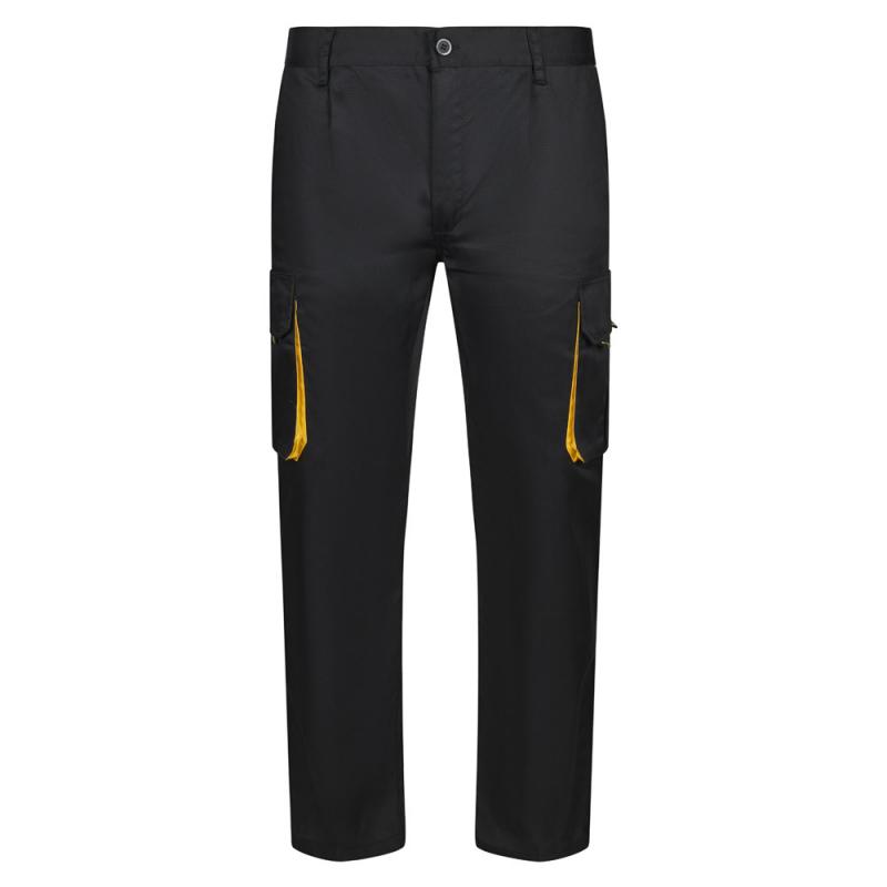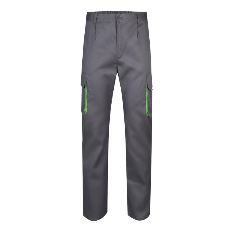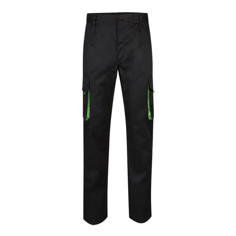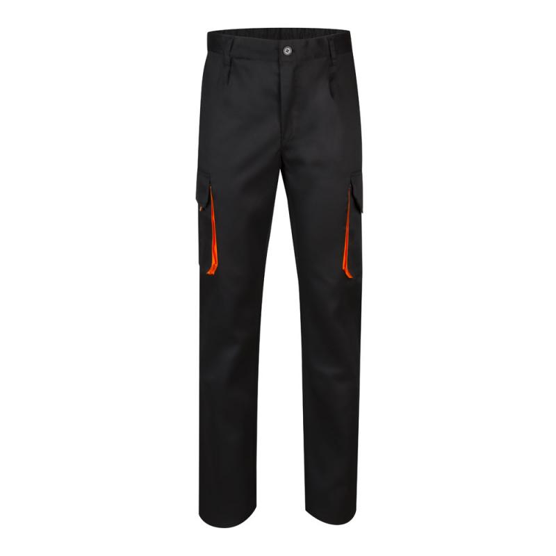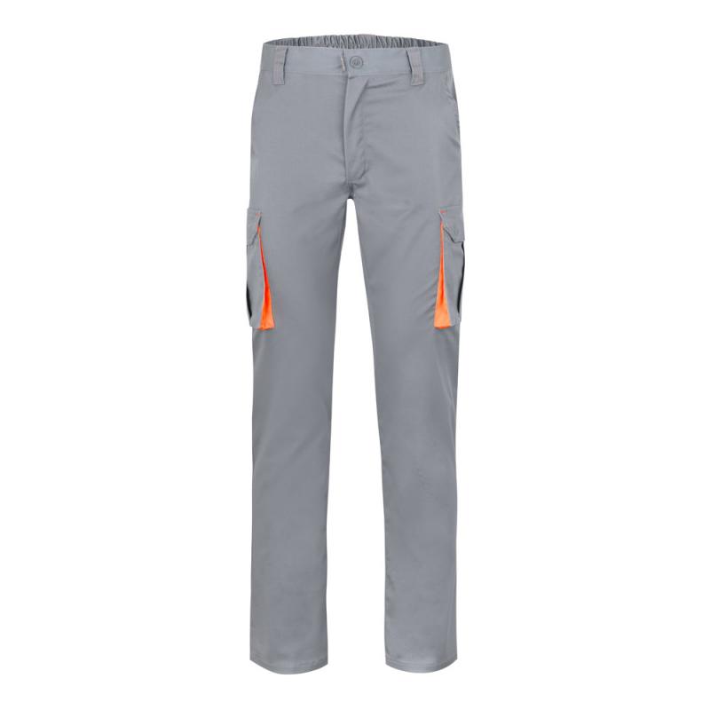 Tweekleurige keperstofbroek met meerdere zakken 200gm² van katoen 35% en polyester 65%. Met elastische tailleband en contrasterende kleur op de inzetstukken trekkers en stiksels. Bevat zes zakken 2 franse zakken 2 zijzakken en 2 achterzakken