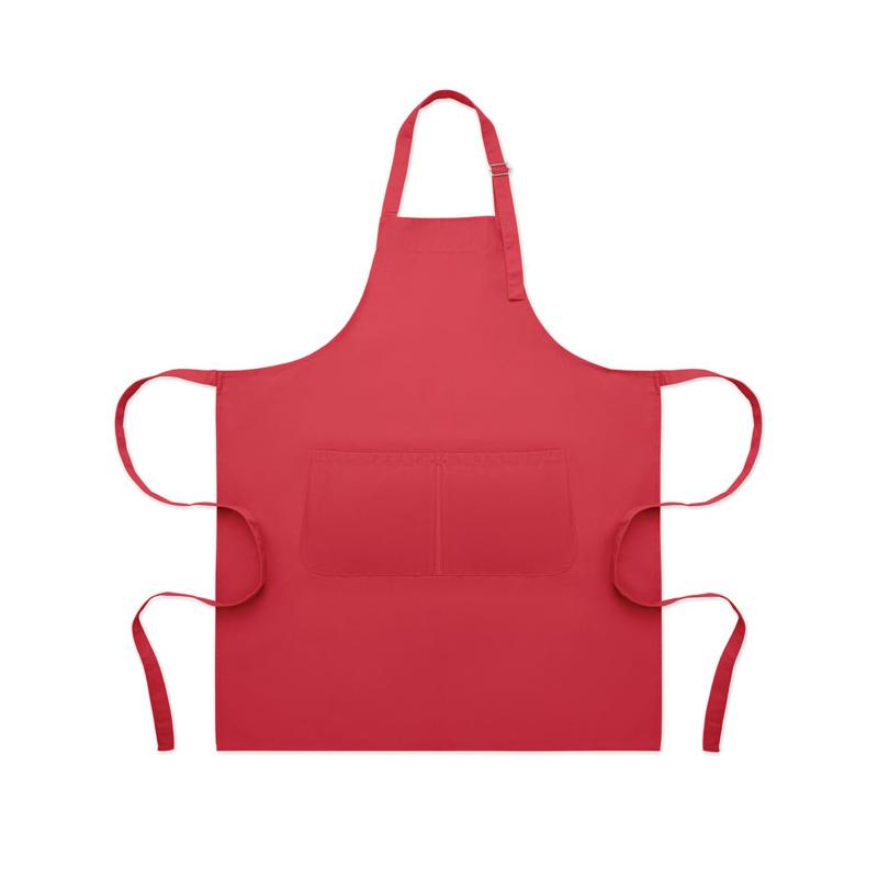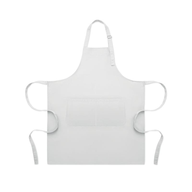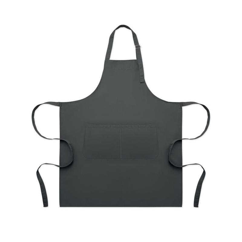 Lang, verstelbaar keukenschort van 240g m² polykatoen (35% katoen, 65% polyester) met twee voorzakken en verstelbare riem metalen gesp.
