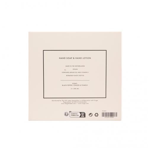 Zijdezachte handen, elke dag. Verzorg je handen met deze heerlijk geurende unisex set, bestaande uit twee flacons van 200 ml: handzeep en handlotion. Met de warme, pittige geur van zwarte peper, gember en pomelo laat deze set je handen zacht, gevoed en subtiel geparfumeerd aanvoelen. Een aanraking die mensen zullen onthouden. Elegant verpakt in een geschenkdoos in crème-wit en zwart.