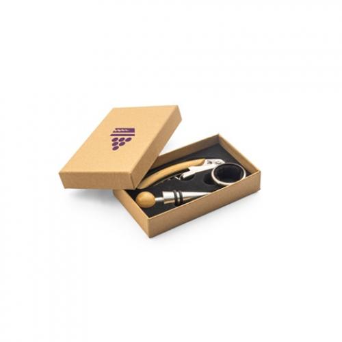 Wijnset van bamboe en roestvrij staal. Inclusief 1 kurkentrekker 1 kurkentrekker en 1 metalen ring. Geleverd in een geschenkdoos van kraftpapier. Omdat dit product gemaakt is van natuurlijke materialen kunnen de kleur en opdruk per product verschillen