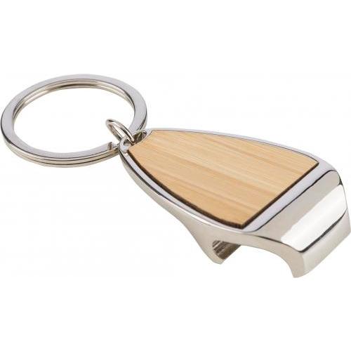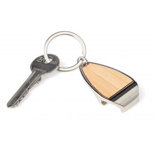Sleutelhanger van zinklegering met metalen sleutelring en bamboe-inleg aan de voorkant. Voorzien van flesopenerfunctie. Verpakt in een papieren zakje.